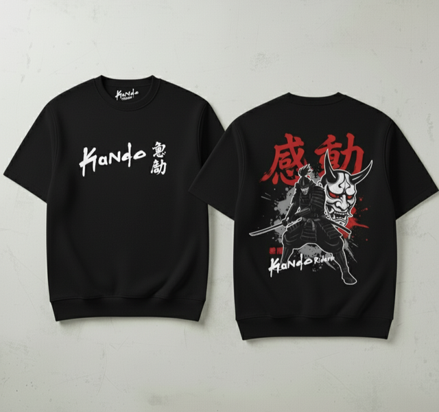 Inspirada en el espíritu libre e indomable del samurái ronin, esta camiseta presenta en la parte frontal el nombre de tu grupo, "Kando", con un estilo que captura la pasión por la velocidad. En la espalda, un imponente samurái con la mística máscara Oni simboliza la fuerza, la hermandad y la protección que se encuentra en la carretera.