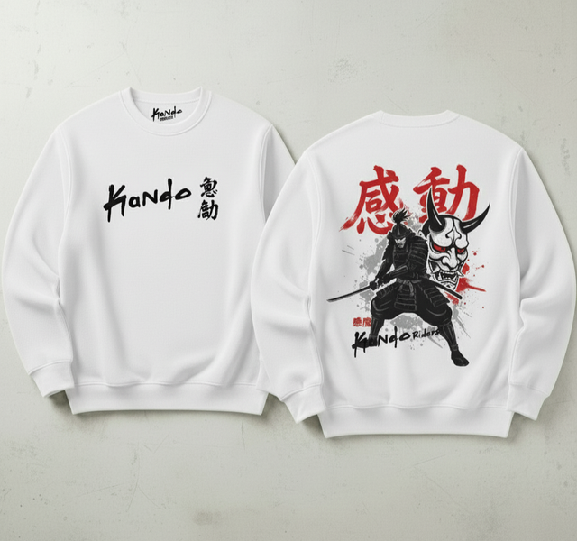 El diseño frontal muestra con orgullo el nombre del grupo, "Kando", mientras que en la espalda, un guerrero samurái y la mística máscara Oni representan la fuerza y la protección de la hermandad.